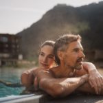 - Wellnesshotel Nesslerhof - Poolsuite - Paar beim Sonnen auf Terrasse vor Berpanaorama