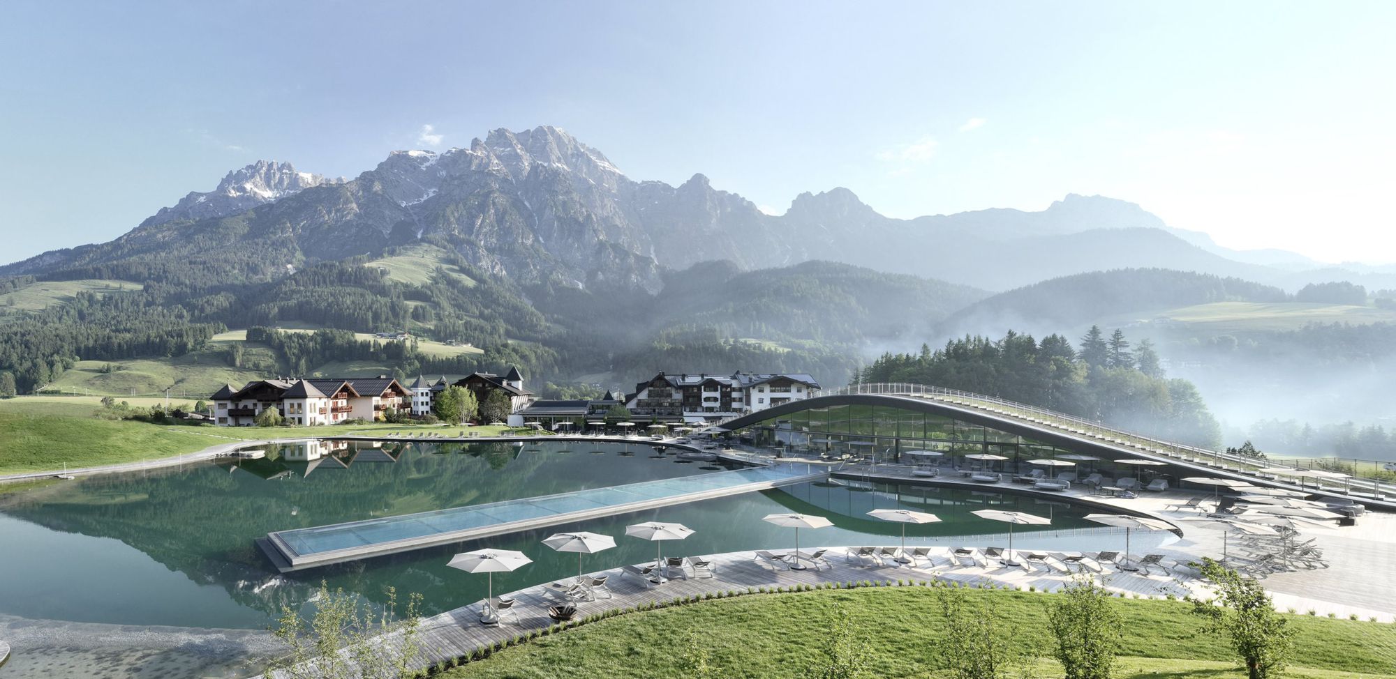 - Ein 5.500 m² Natur-Badesee mit einem 50 m langen integrierten Infinity-Pool